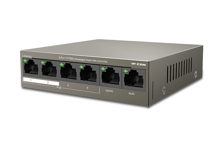 F1106P-4-63W is an unmanaged PoE switch with 2 uplink ports, independently designed by IP-COM. Compliant with IEEE 802.3at/af standards, it can identify PoE-powered devices intelligently. The switch supplies a maximum PoE power output of 63 W, and 30 W for a single port. Featured with extend mode and QoS function, F1106P-4-63W is a ideal choice for SMBs, supermarkets and restaurants with small-sized video surveillance requirement.